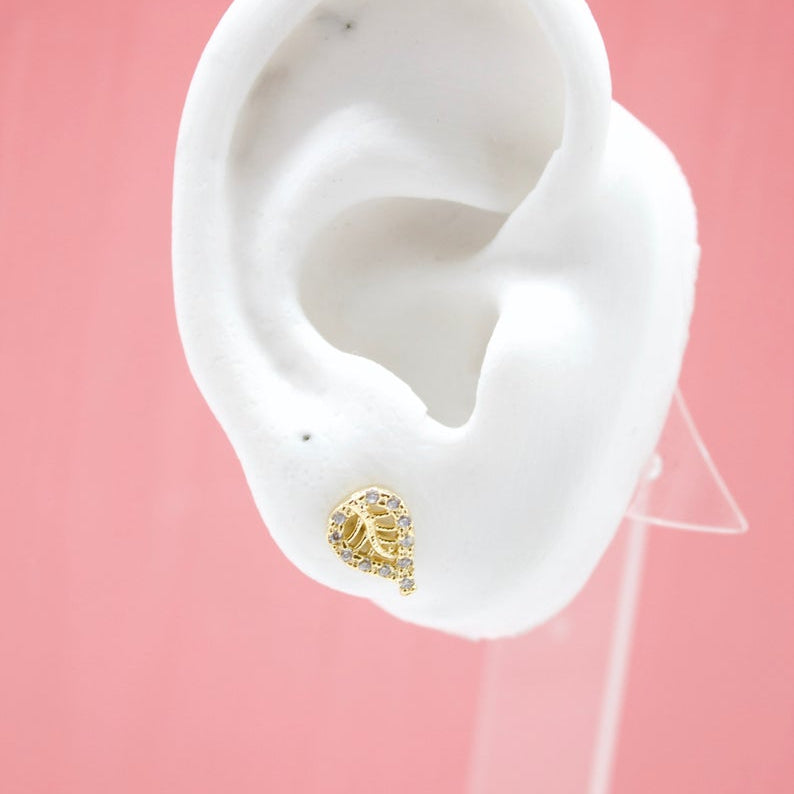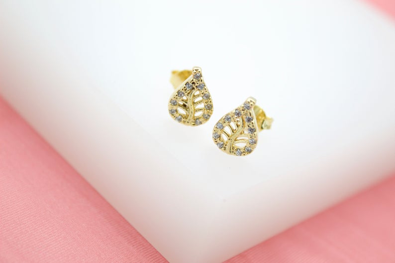 18K Gold Filled Leaf Stud Earrings With Micro CZ Cubic Zirconia Stone (L110)