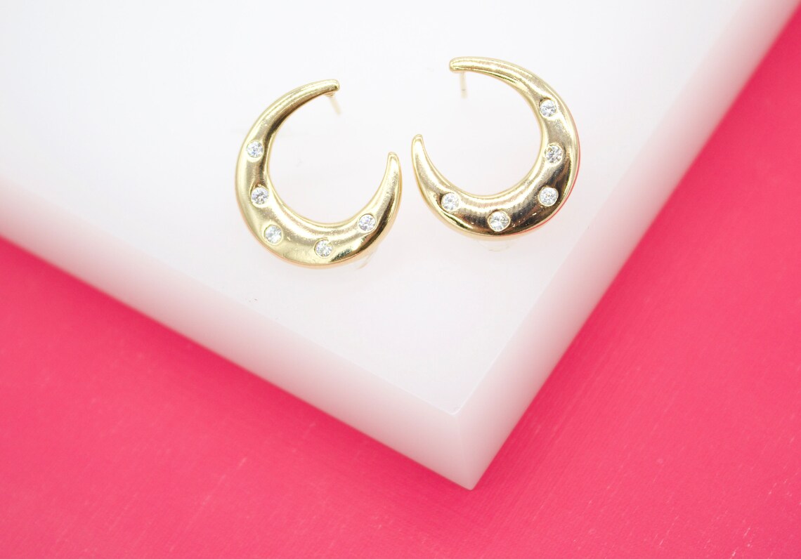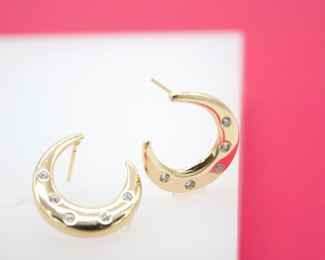 18K Gold Filled Moon Crescent Stud Earrings With Cz Stones