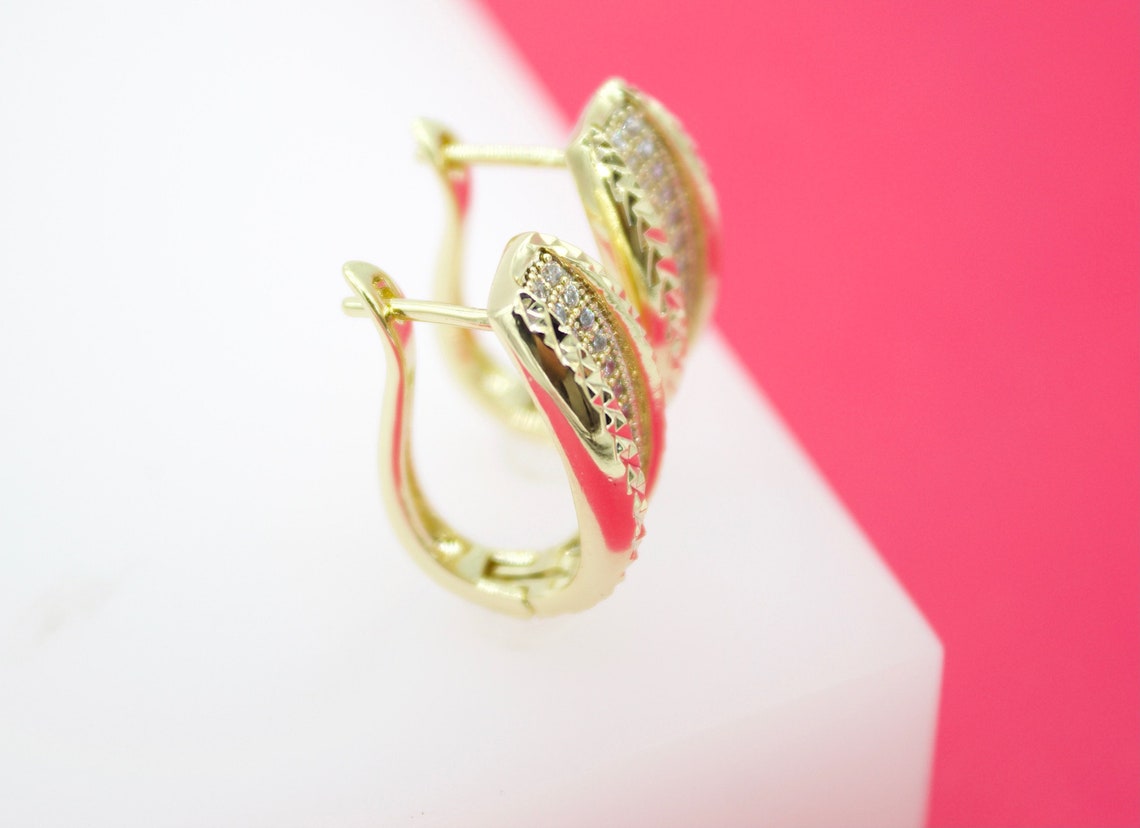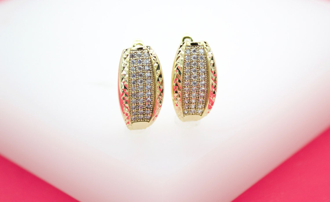 18K Gold Filled Textured Oval Huggies Pave Earrings With Micro CZ Cubic Zirconia Stones (L273)