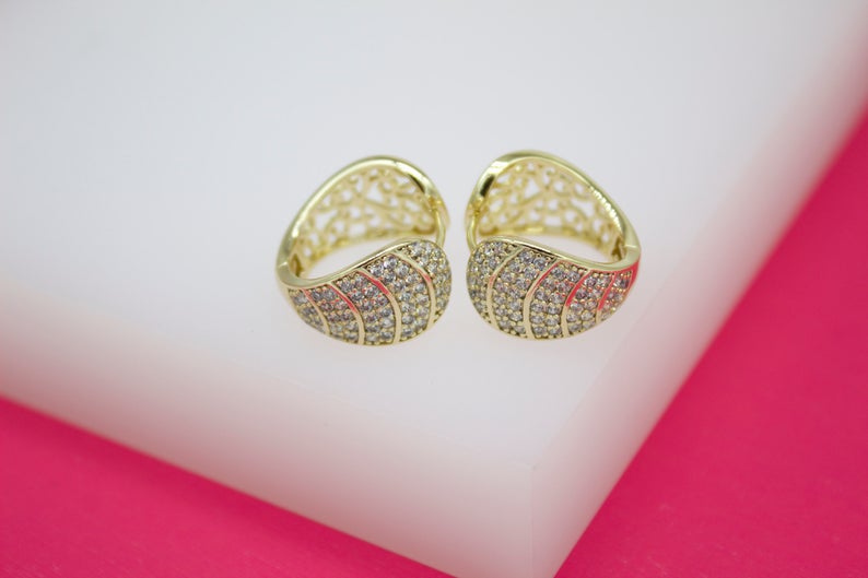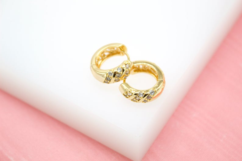 18K Gold Filled Thick Huggies Earrings With Cubic Zirconia Clear Stones (K234)