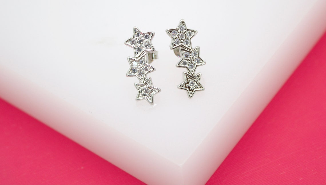 18K Rhodium Filled Three Stars Stud Earrings With CZ Cubic Zirconia Stones (L77)