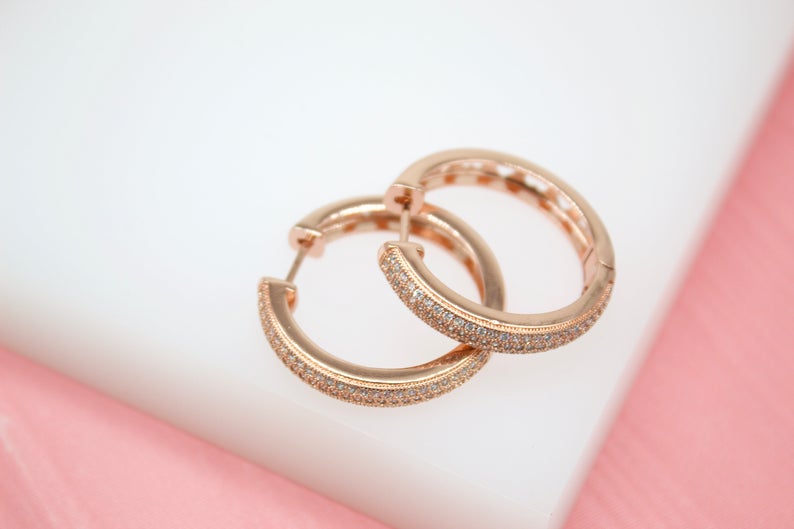 18K Rose Gold Filled Huggies Earrings With Micro CZ Cubic Zirconia Stones