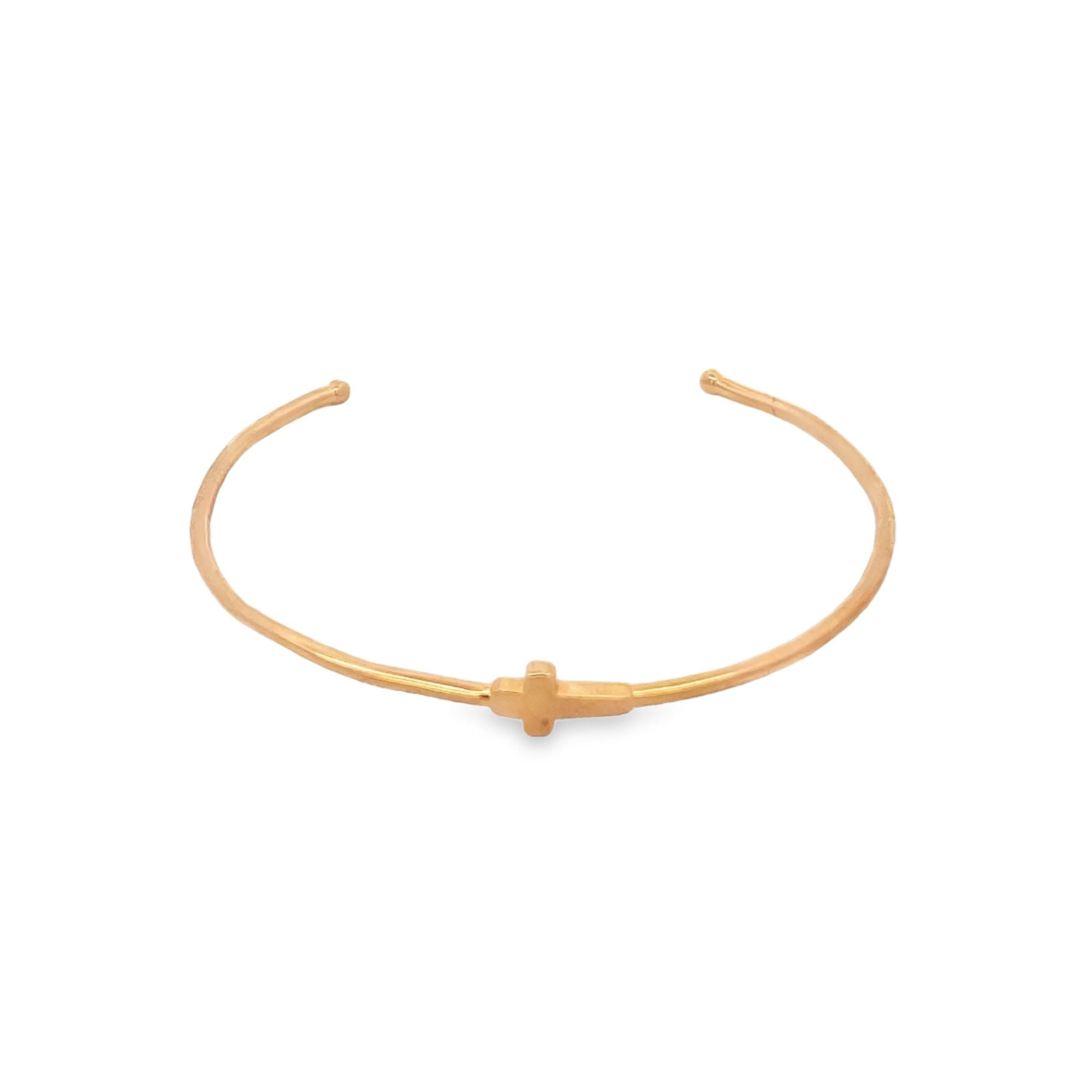 Enhance your accessory collection with this elegant Minimalist Cross Open Bangle Cuff Bracelet. Made from durable 18K Gold Filled material, it features a sleek, minimalist design with a 1mm thickness and a 7-inch size.