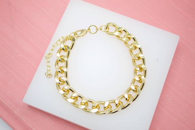 18K Gold Filled 11mm Diamond-Cut Curb Cuban Link Bracelet Chain (I239)