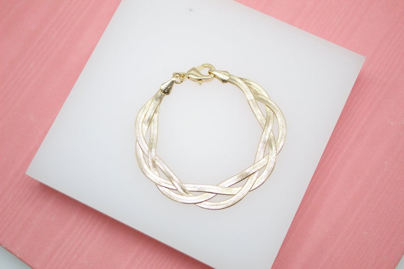 18K Gold Filled 3mm Triple Twisted Herringbone Snake Chain Bracelet (I14)