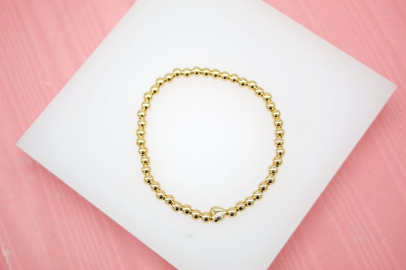 18K Gold Filled 4mm Gold Elastic Bead Bracelet With HEART Charm (I48)