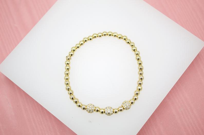18K Gold Filled 4mm Gold Elastic Bead Bracelet With Three Round CZ Charm (I30)