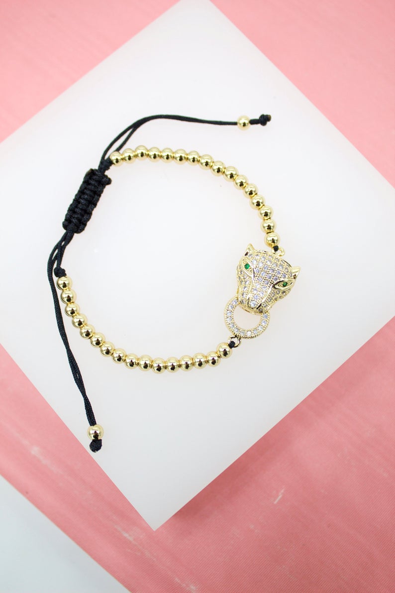 18K Gold Filled Adjustable Bead Bracelet With Leopard Head
