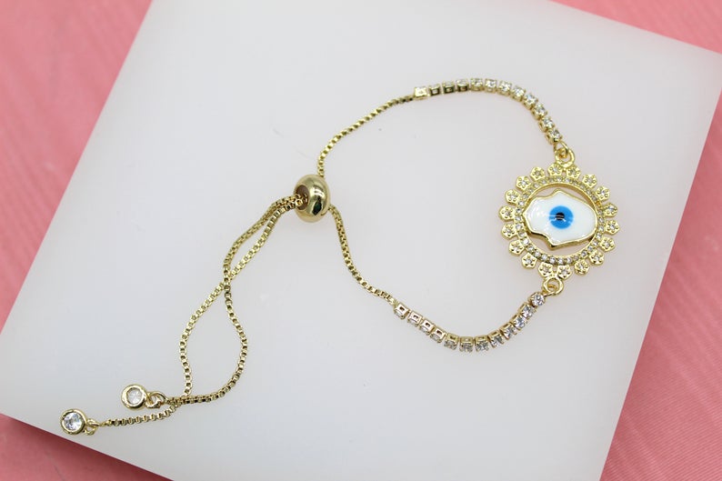 18K Gold Filled Adjustable Box Chain Bracelet With Clear CZ Stones On A Evil Eye Charm (I141)