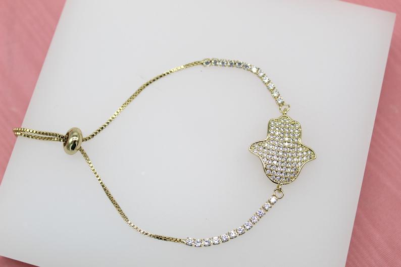 18K Gold Filled Adjustable Box Chain Bracelet With Clear CZ Stones On A Hamsa Hand Charm