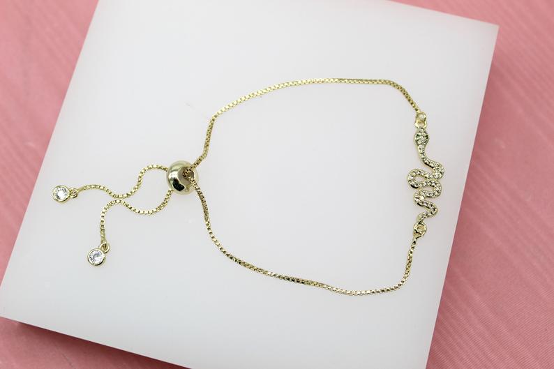 18K Gold Filled Adjustable Box Chain Bracelet With CZ Cubic Zirconia Stones And Snake Charm (I141)