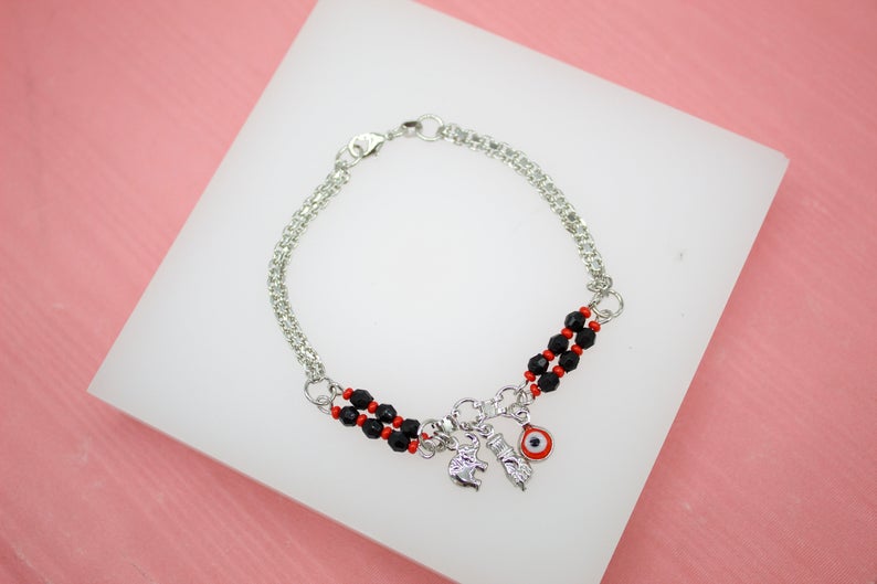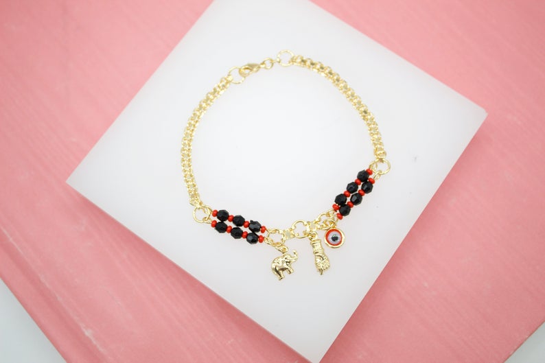18K Gold Filled Azabache Chain Bracelet With Elephant, Evil Eye, Protection Charm (I88)