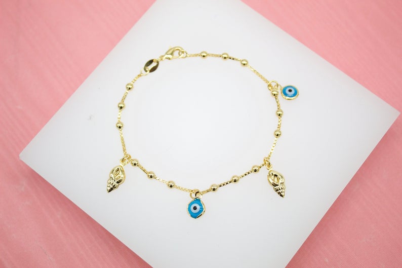 18K Gold Filled Blue Dangle Colorful Evil Eye And Sea Shell Charms Bracelet (I223)