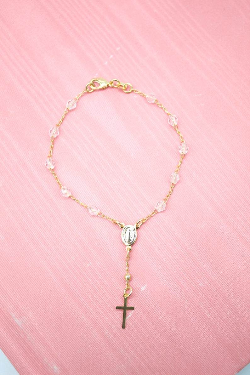 Elevate your jewelry collection with our 18K Gold Filled Cross and Virgin Mary Charm Bracelet. Measuring 6 3/4 inches in length, this elegant piece features a 9mm x 6mm Virgin Mary charm and a 12mm x 7mm Cross charm, complemented by beautiful clear beads (3.80mm).