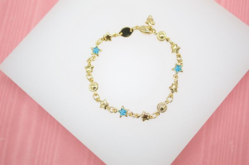 18K Gold Filled Star Charms Bracelet With Blue Star CZ Stones (I154)