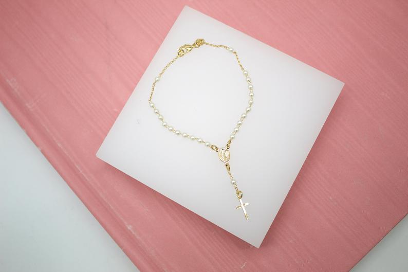 This beautiful Gold Filled bracelet features Virgin Mary (8mm x 6mm) and cross charms (13mm x 7mm) with 3mm pearls. Length: 7 1/4 inches.