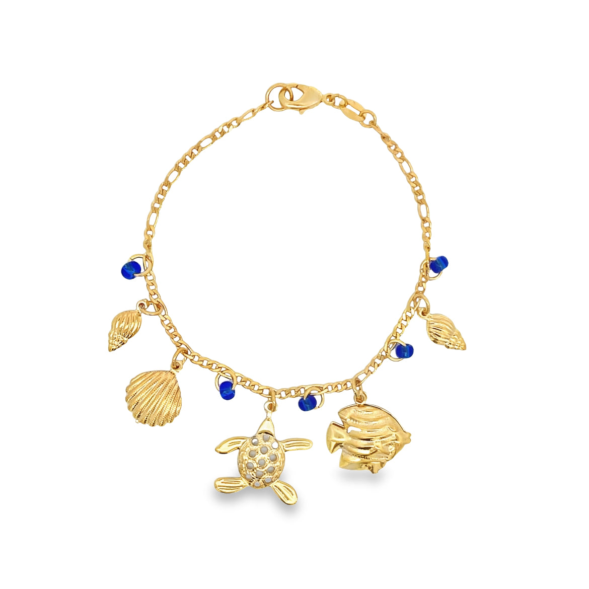 Blue Bead Bracelet With Fish, Turtle, Sea Shell Charms For Wholesale Jewelry And Findings 18K Gold Filled (I165)