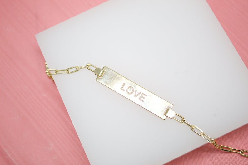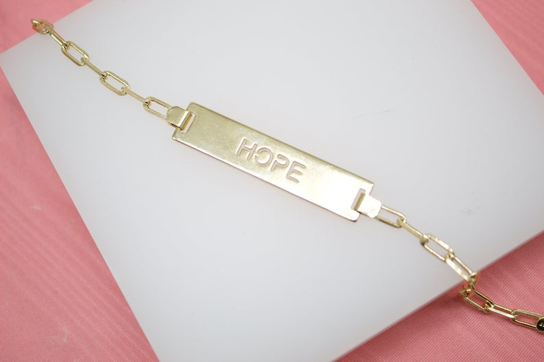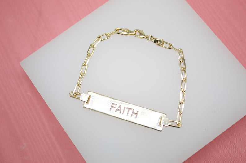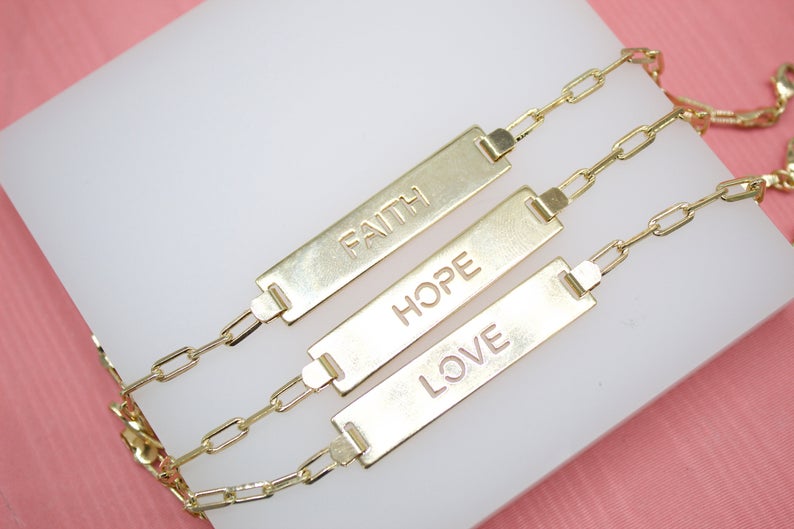 Indulge in opulence with our Plate Charm Paperclip Link Bracelet. Adorned with a "Faith", "Hope", or "Love" charm, this intricate piece is both a fashion statement and a reminder of life's greatest virtues. Elevate your style and spirit with this exclusive accessory.