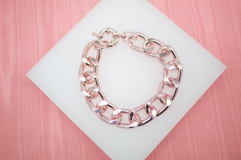 18K Gold Filled Pink Chunky Thick Curb Cuban Link Chain Bracelet (XX8)