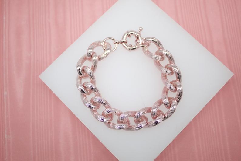 18K Gold Filled Pink Textured Chunky Thick Curb Cuban Link Chain Bracelet (XX8)