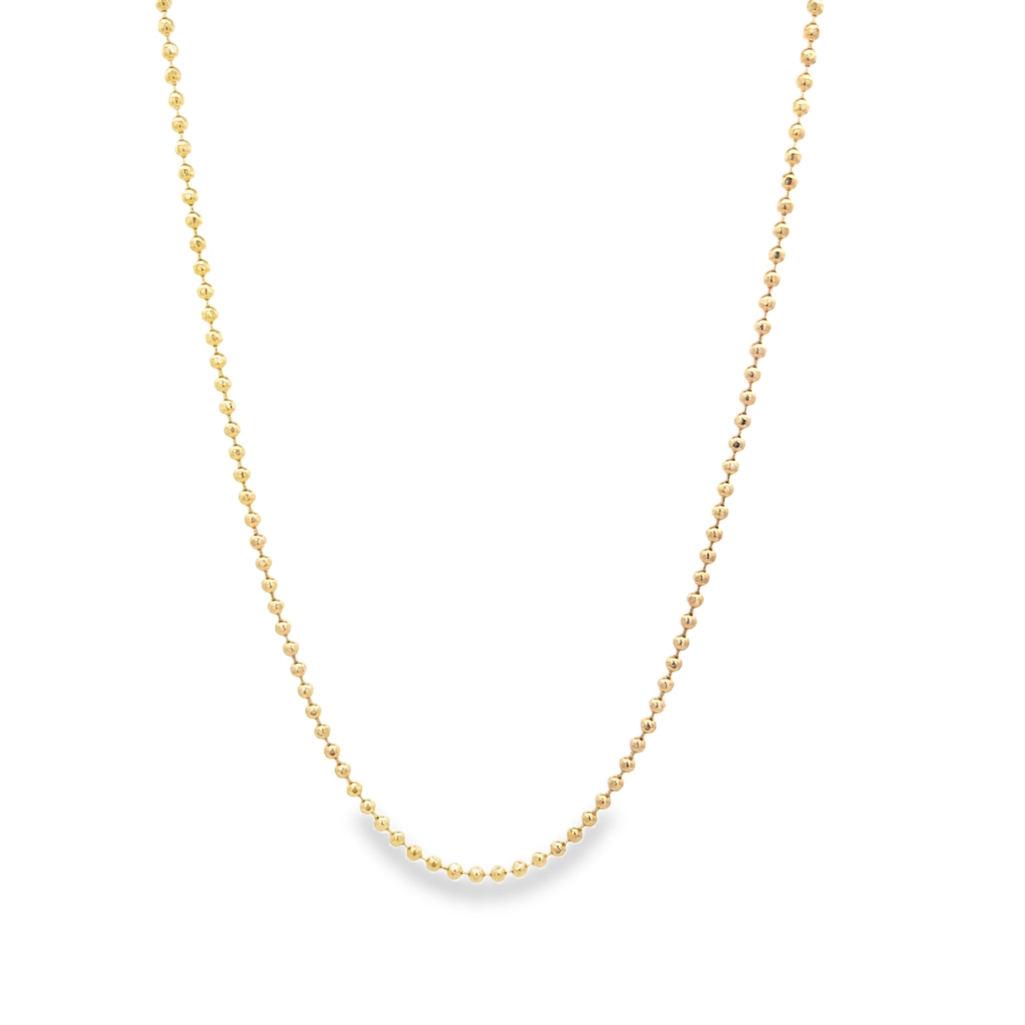 Elevate your style with our 2mm Diamond Cut Ball Chain. Perfectly crafted with luxurious precision, its intricate diamond cut design adds a touch of sophistication to any outfit. Available in various lengths, this premium chain is a must-have for any fashion-forward individual. Make a statement with this exclusive piece.