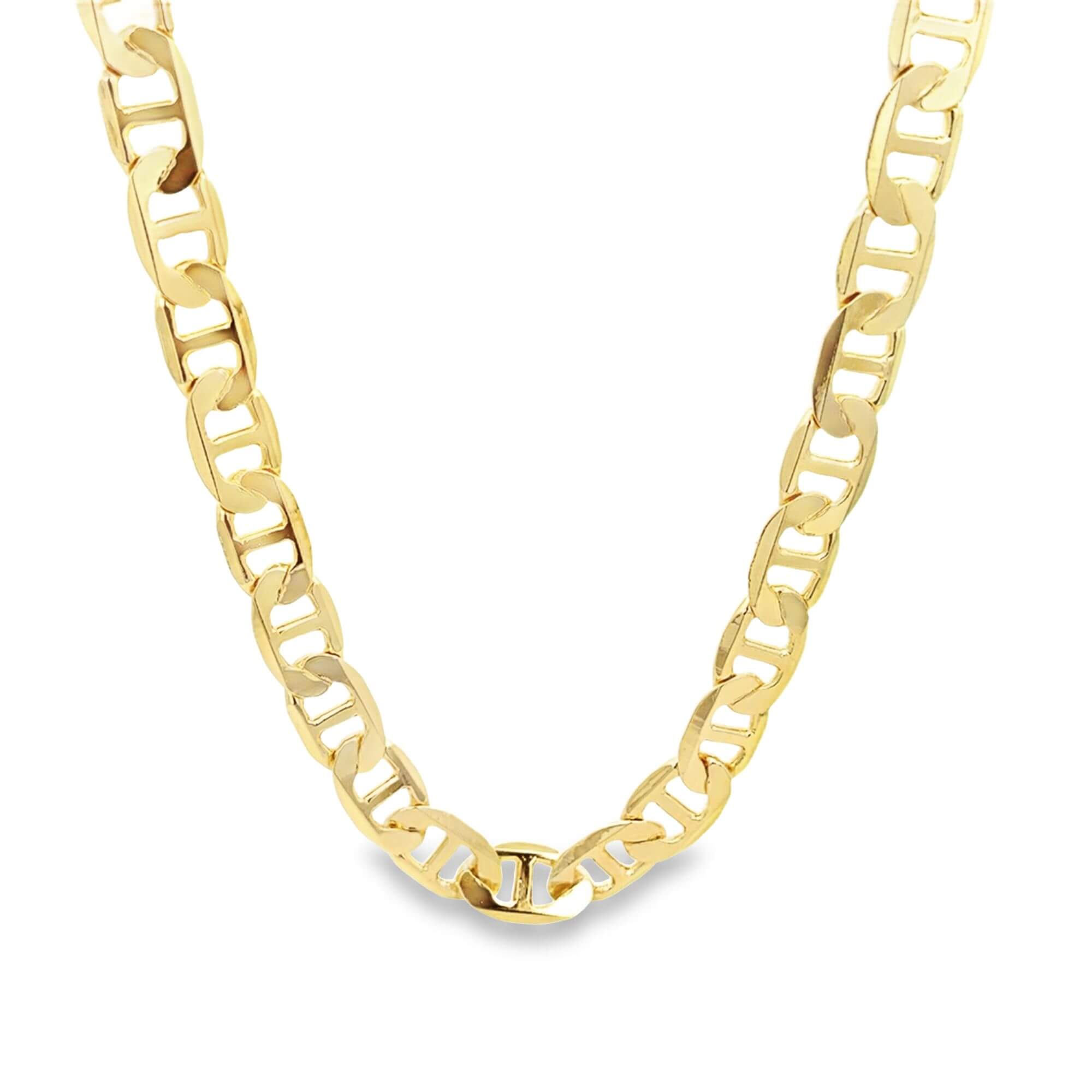 Indulge in the timeless elegance of our 9mm Mariner Link Chain. This stunning piece is crafted with precision and features a sophisticated mariner link design. The perfect balance of luxury and versatility, our chain is a must-have for any stylish wardrobe. Elevate your look with this exclusive accessory.