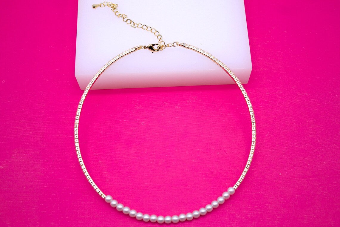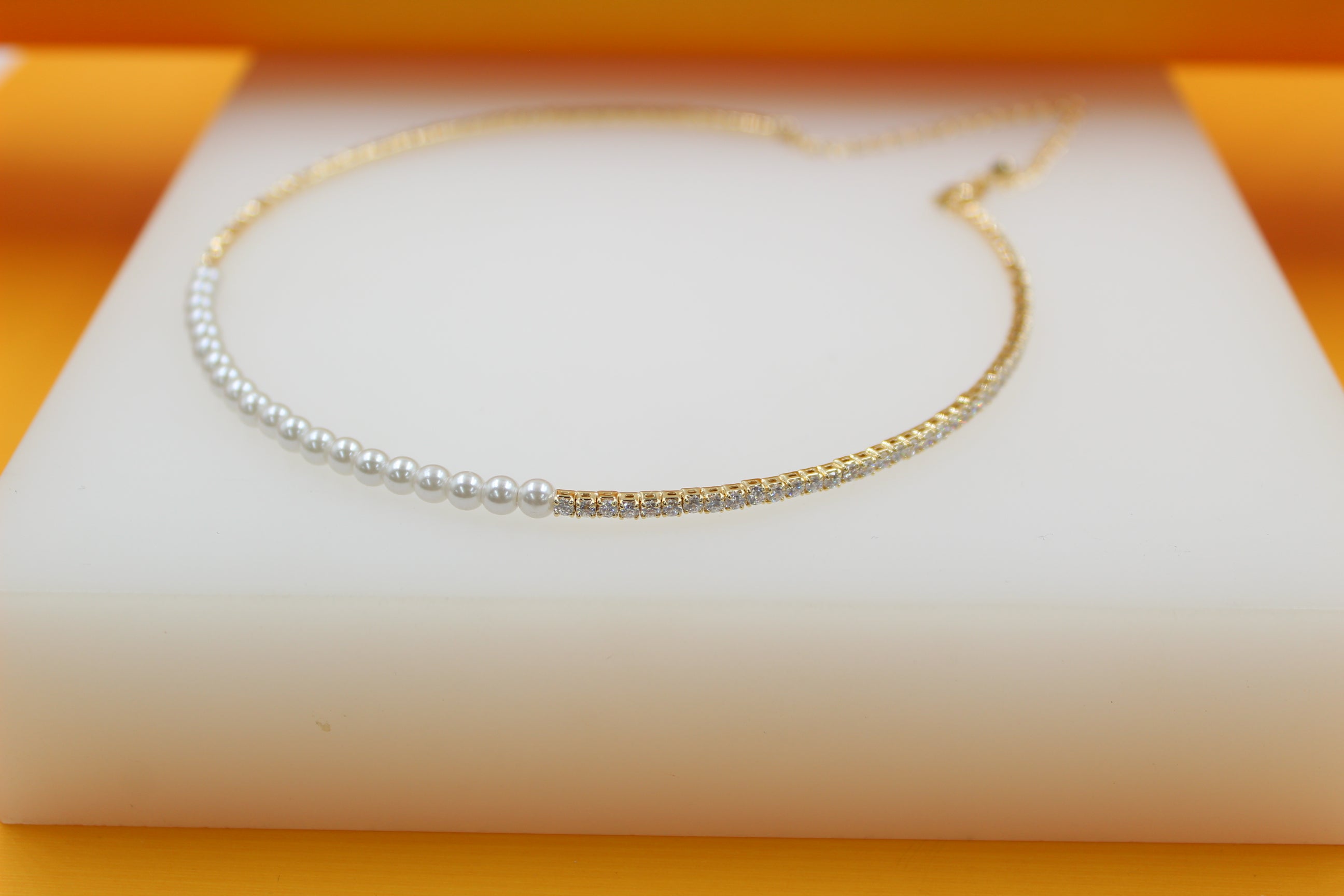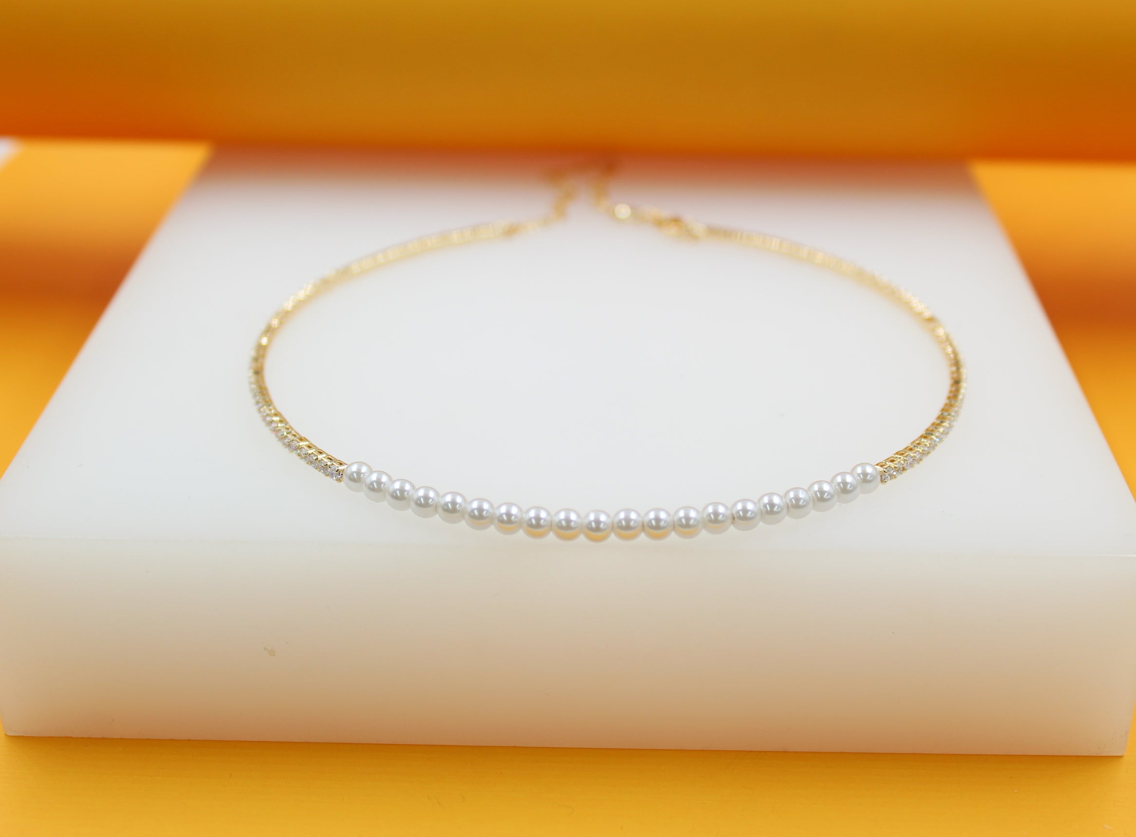 18K Gold Filled Pearl Neck Choker With Round CZ Stones (H54)