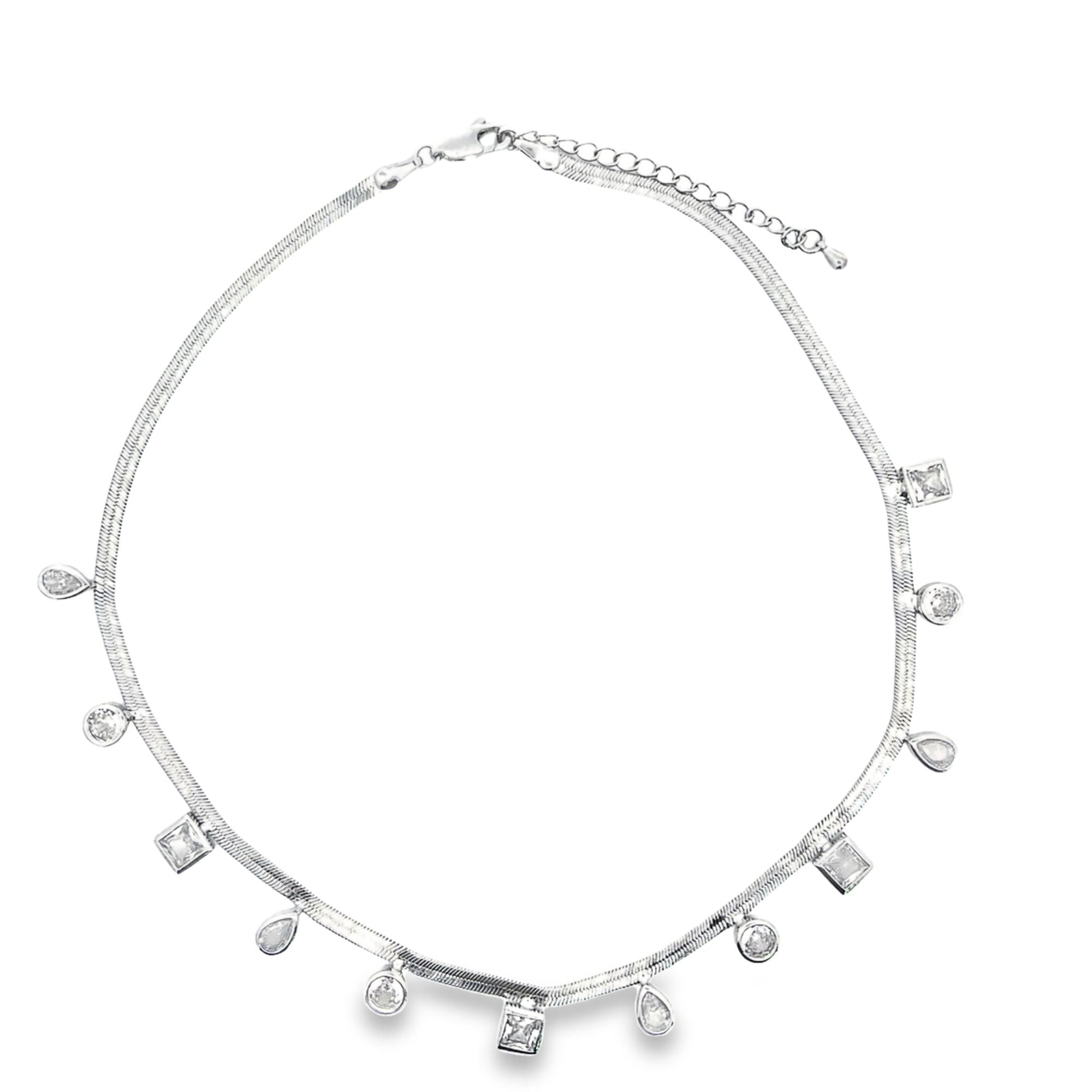Embrace sophistication with our Rhodium Clear CZ Shape Charms Herringbone Necklace, adding a touch of luxury to any outfit. Each CZ shape represents an exquisite piece of art, handcrafted with the finest materials. Elevate your style with this exclusive necklace, perfect for any occasion.