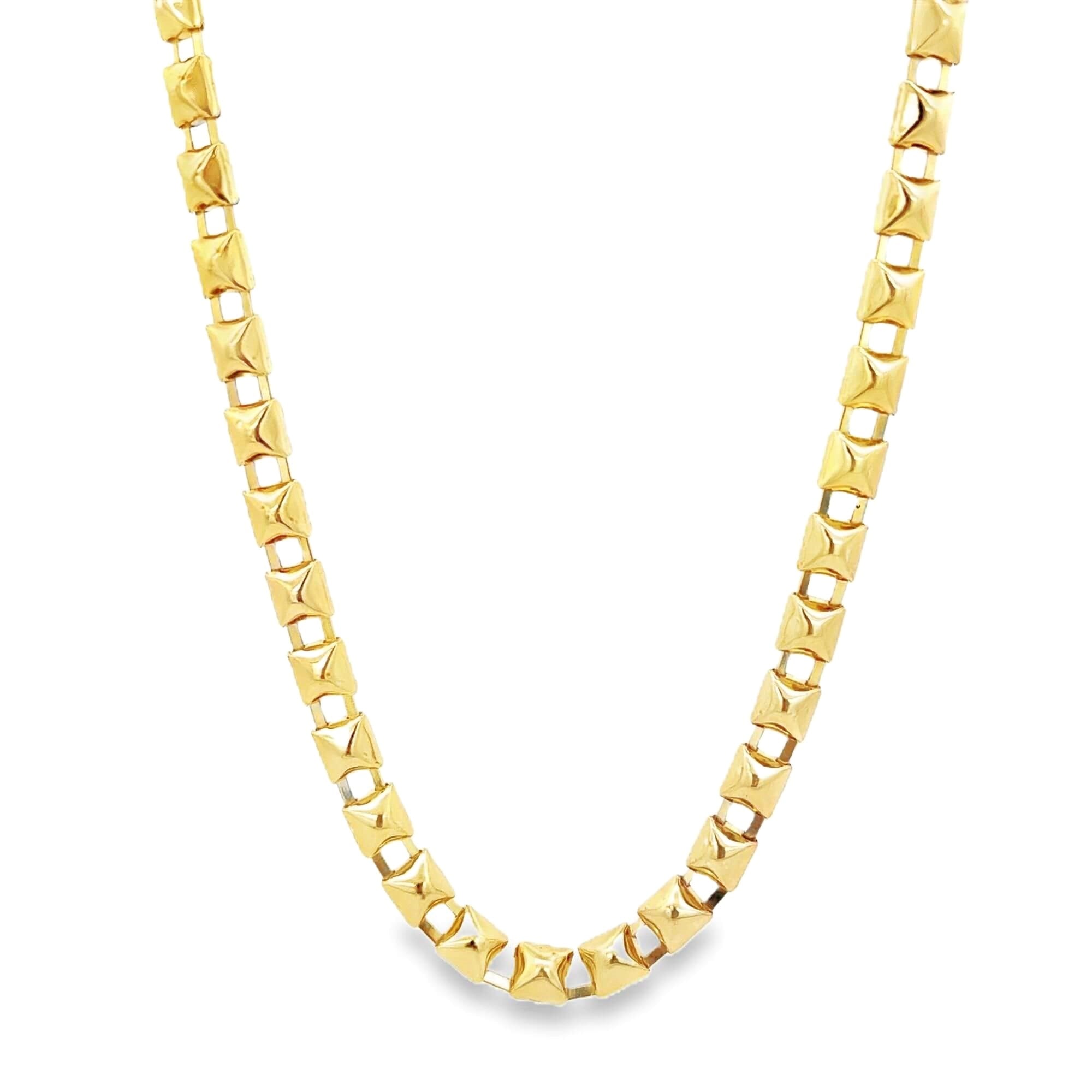 This exquisite choker boasts a unique geometric design featuring square pyramids, adding a touch of modern sophistication to any outfit. Crafted with high-quality materials, this statement piece will elevate your style and make you stand out in any crowd. Upgrade your jewelry collection with this luxurious link choker.