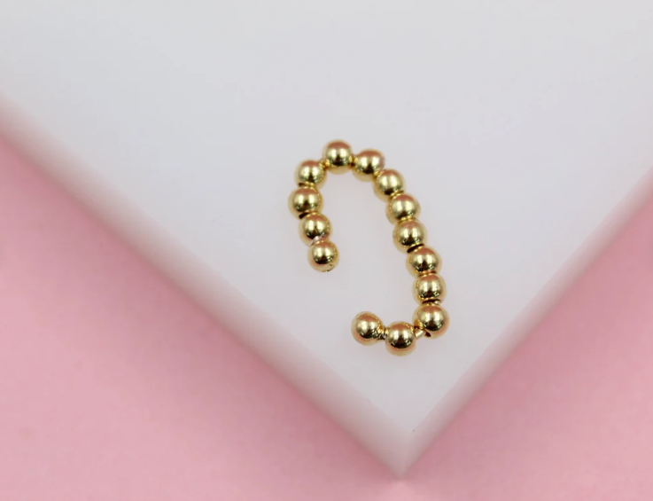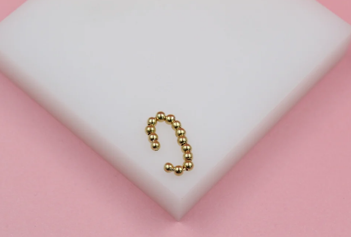 Elegant Gold Filled Oval Shaped Gold Beaded Cuff Earrings. Crafted from 18K Gold Filled material, these cuffs are adjustable and feature a 15mm diameter and 4mm thickness.