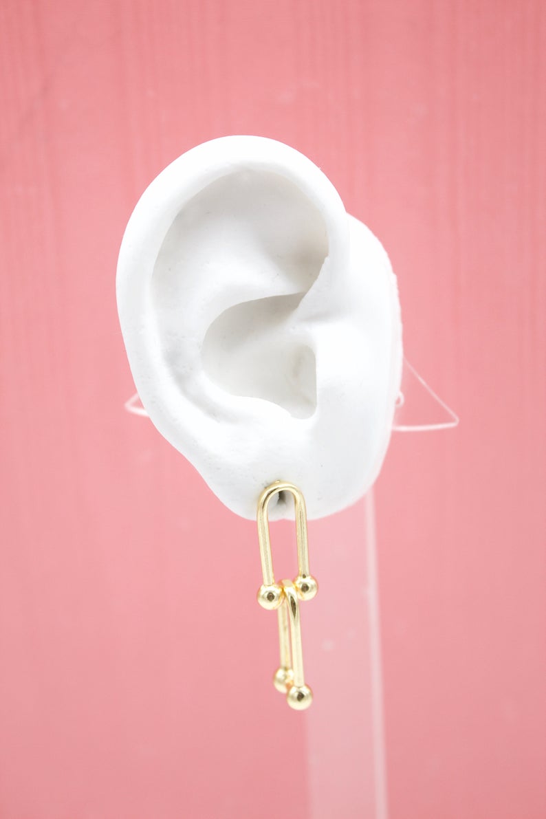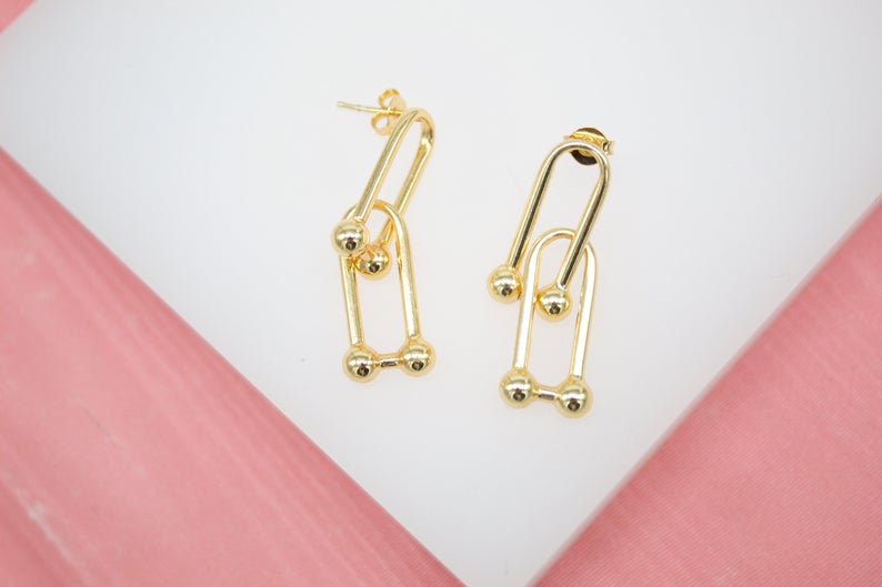 18K Gold Filled Double Long Drop Oval U Hoops Hoops Link Earrings (K123A)