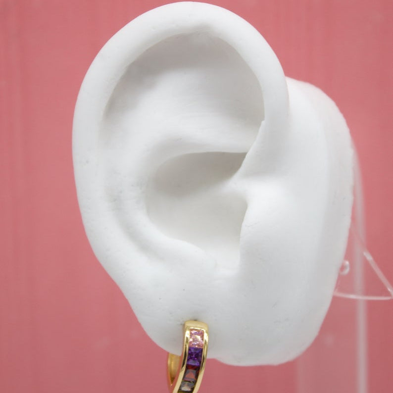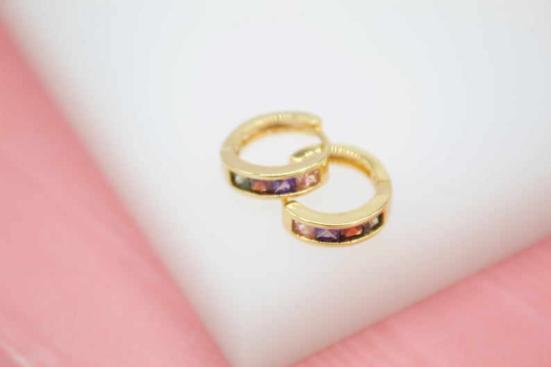 18K Gold Filled Huggies Earrings With Multi Color Rectangle CZ Cubic Zirconia Stones (L73)(STYLE B)