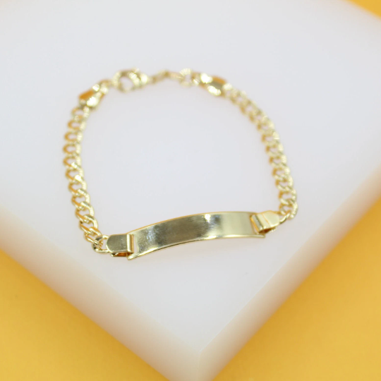 Indulge in luxury with our Gold Filled Dainty Curved Plate Kid Curb Chain Bracelet. The delicate, curved design adds an elegant touch to any outfit, while the gold filled material exudes exclusivity and sophistication. Elevate your style with this must-have piece, perfect for both kids and adults alike.