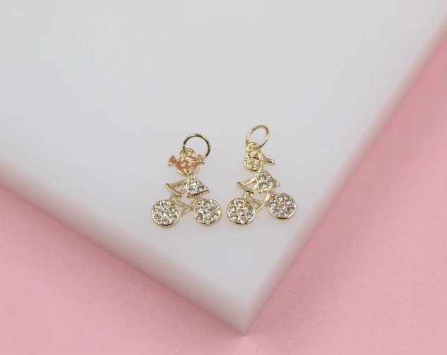 Gold Filled Kid Girl & Boy Riding A Bike Pendant Charms With Clear Stones