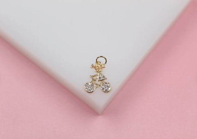 This pendant charm features a detailed design of a kid girl and boy riding a bike, made of high-quality gold-filled material and adorned with clear stones. With a unique and eye-catching design, this charm adds a touch of whimsy to any outfit. Perfect for those who appreciate quality craftsmanship and playful style.