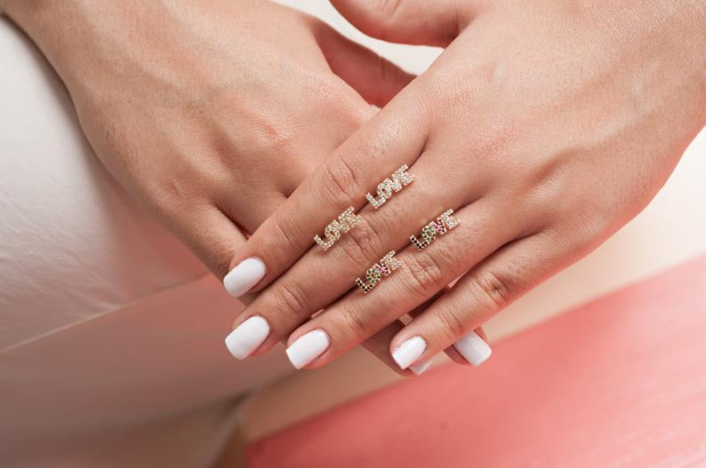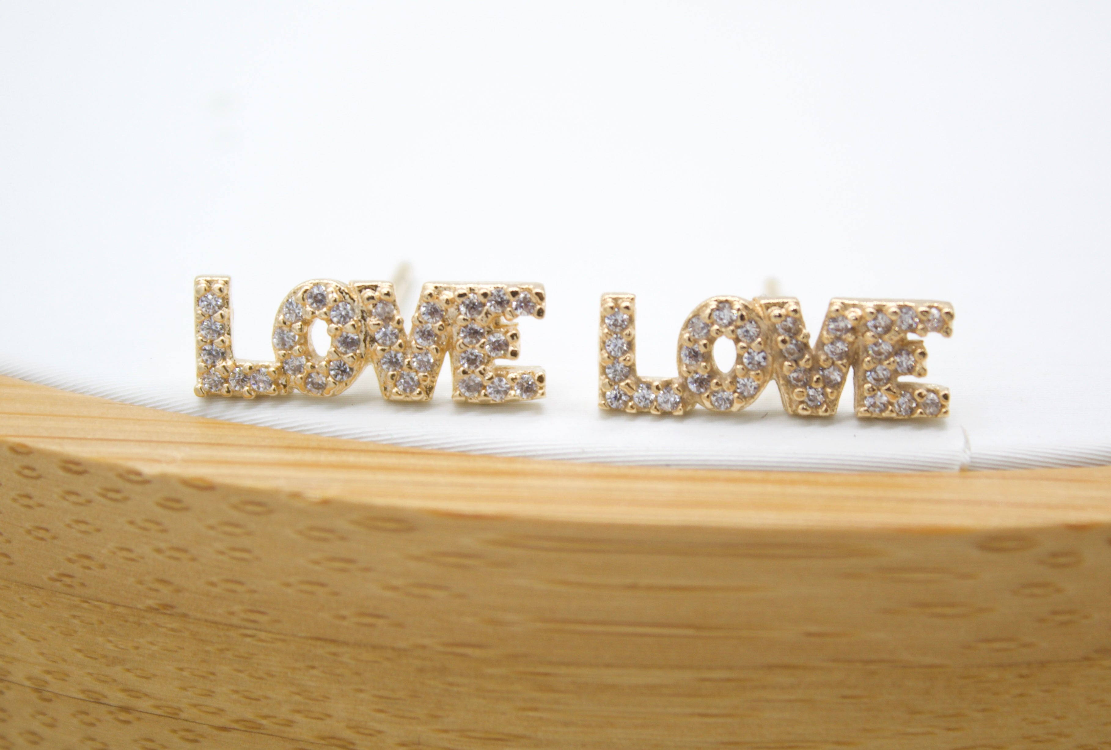Cubic zirconia studded 'LOVE YOU' stud earrings.