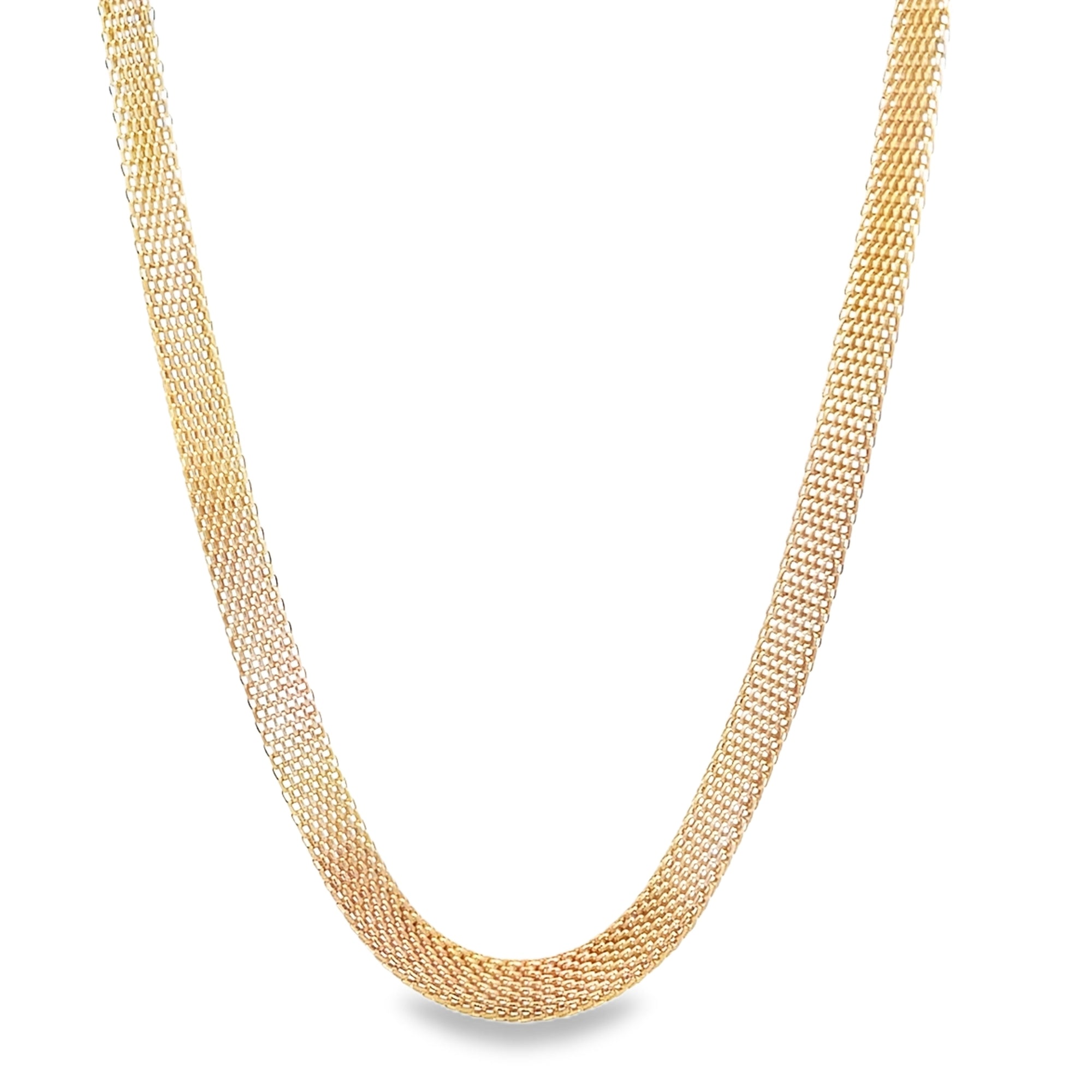 Introducing our exquisite Designed Mesh Link Necklace. Crafted with delicate mesh links, this necklace exudes elegance and sophistication. Its impeccable design and intricate details make it a true work of art. Perfect for adding a touch of luxury to any outfit. Elevate your style with this exclusive piece.