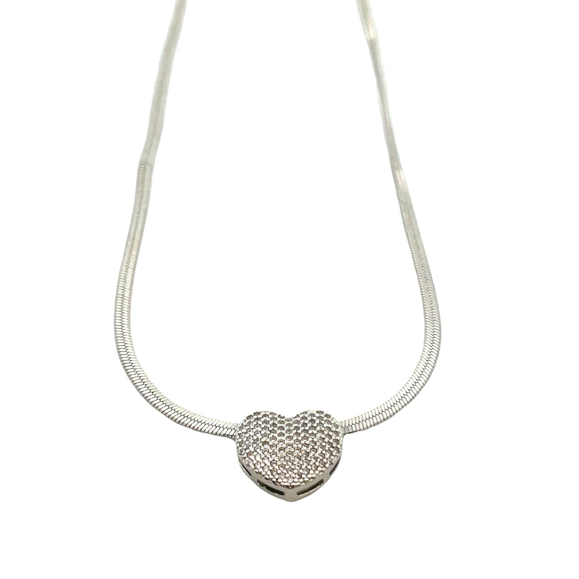Rhodium 2mm Herringbone CZ Paved Heart Charm Necklace