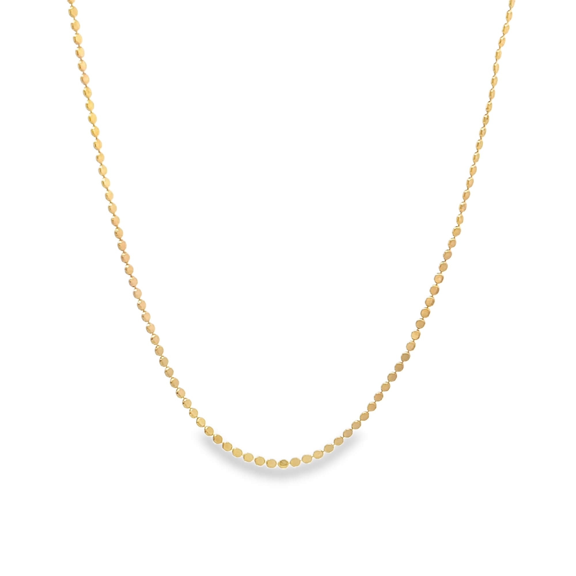 This dainty thin flat disc bead chain offers a subtle yet elegant accent for any ensemble. Its slim, refined design provides a sophisticated shimmer, making it versatile for layering or wearing solo to elevate your style with timeless grace.