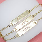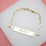 Indulge in opulence with our Plate Charm Paperclip Link Bracelet. Adorned with a "Faith", "Hope", or "Love" charm, this intricate piece is both a fashion statement and a reminder of life's greatest virtues. Elevate your style and spirit with this exclusive accessory.