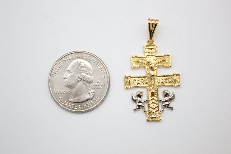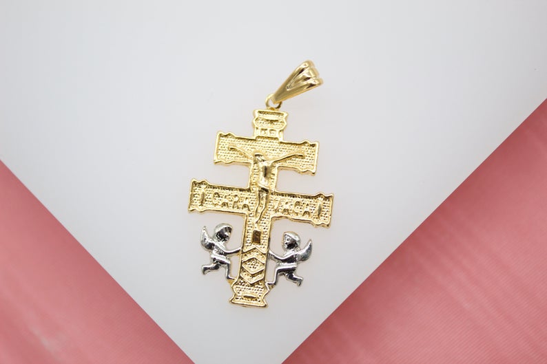 Explore the Cruz De Caravaca Cross, beautifully crafted in gold-filled material. This elegant pendant measures 15cm x 8cm and is a meaningful piece for those who value their faith.