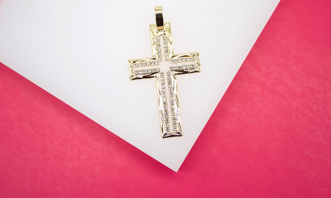 Shop our Gold Filled Outlined CZ Cross Crucifix Pendant, measuring 48mm x 28mm.
