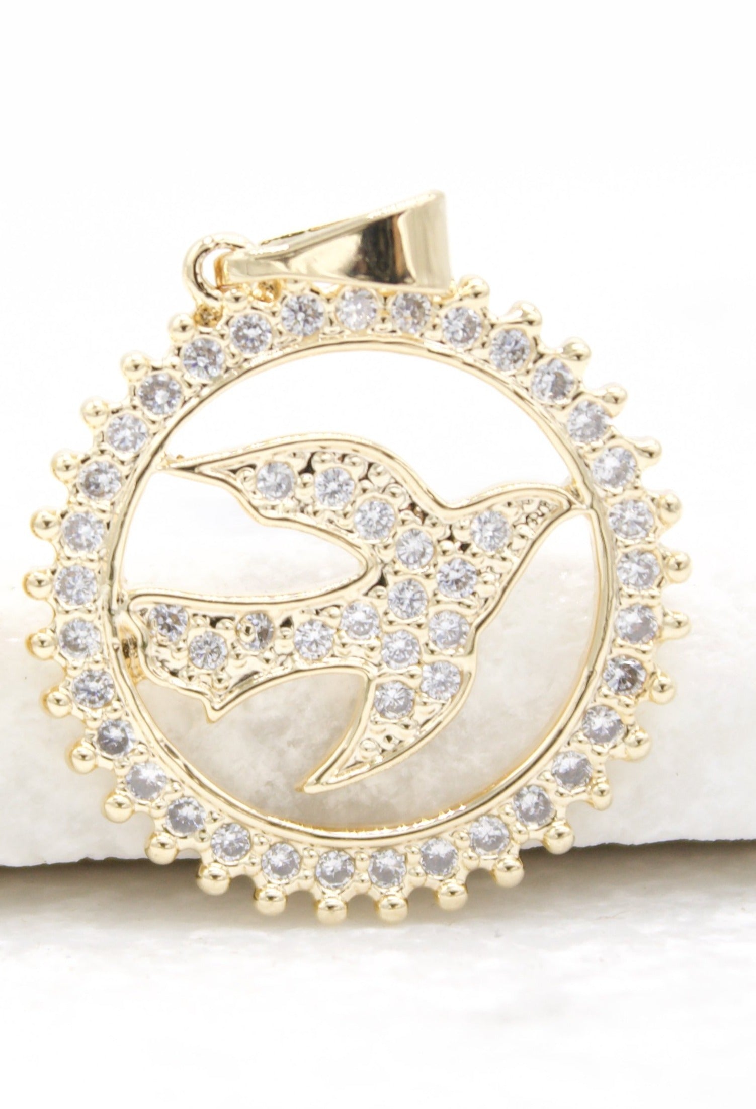 18k Gold Filled Round Medallion Bird Pendant With CZ Stones
