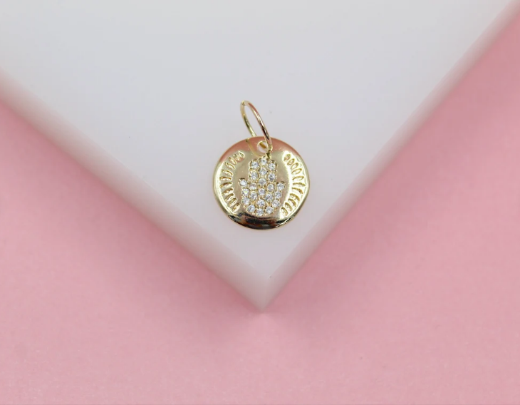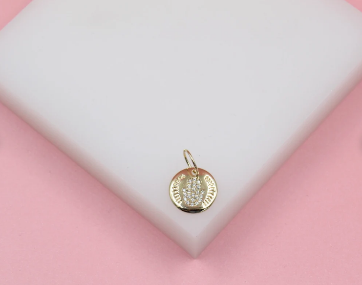 Gold Filled Hamsa Hand Medallion Charm Pendant With Carvings & Clear Zirconia Stones