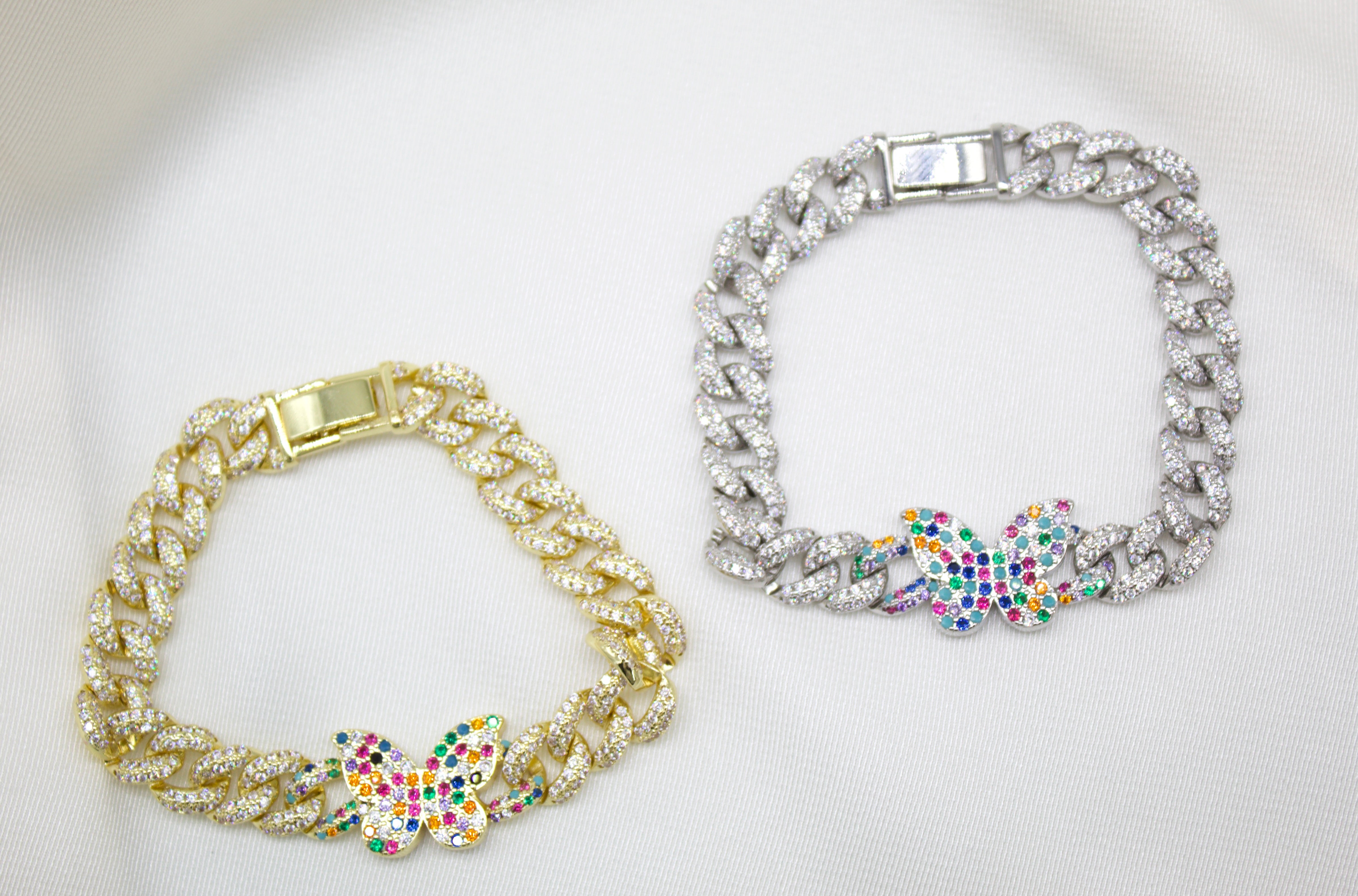8mm Cuban Multi Color Micro Pave CZ Bracelet With Butterfly Charm (I20)