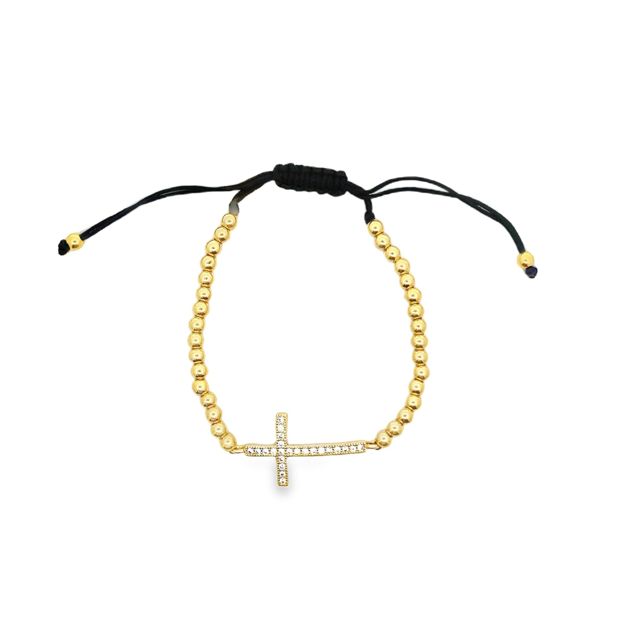 Elegant adjustable bead bracelet featuring a cross charm, crafted in 18K gold filled material. Perfect for any occasion.