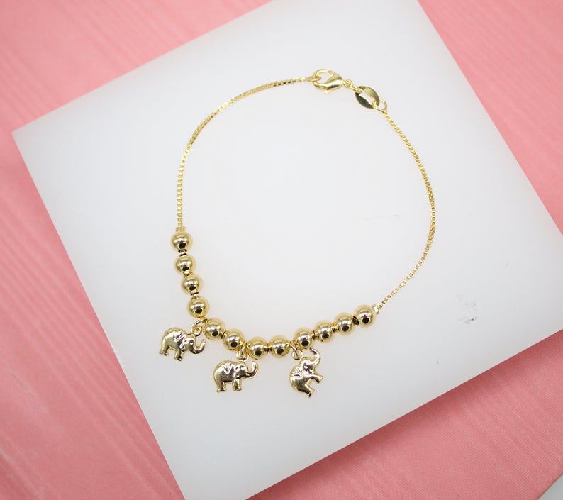 18K Gold Filled Beaded Chain Bracelet With Elephant Charms (I187)