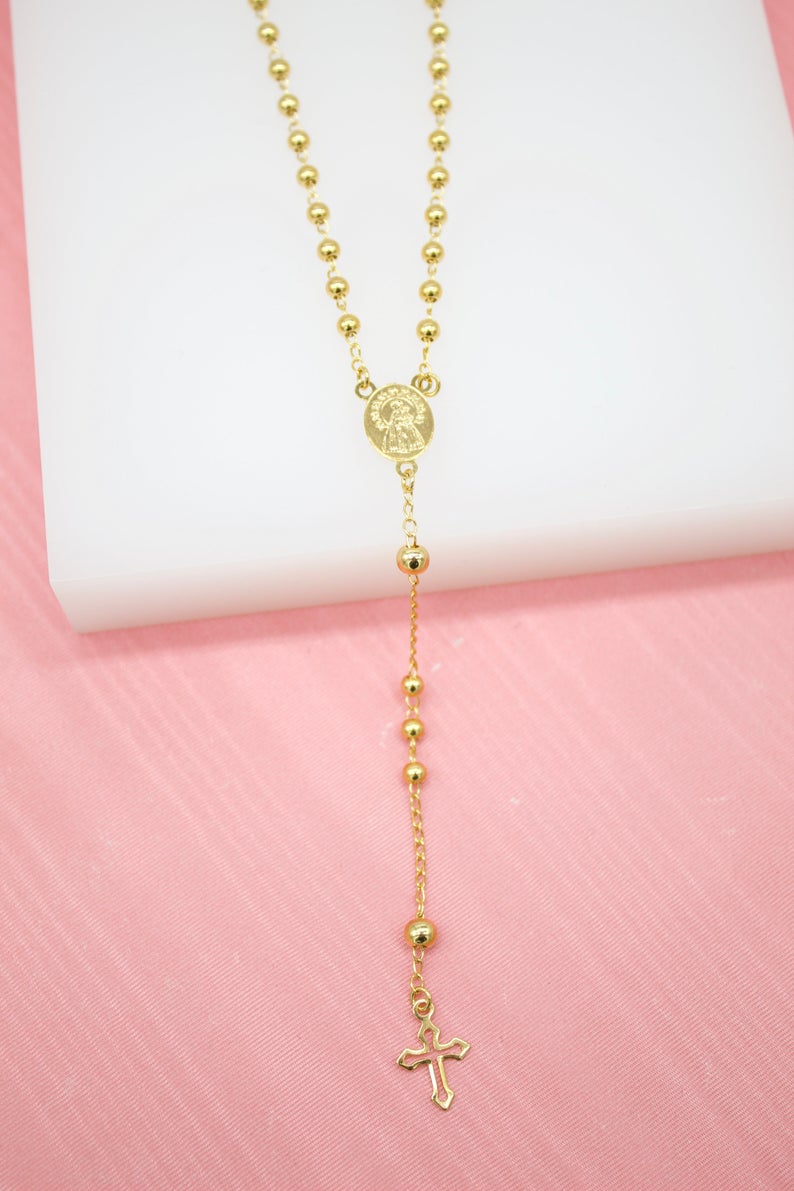 Elevate your spiritual practice with our 18K Gold Filled Caridad Del Cobre Gold Bead Rosary. Crafted with exquisite detail, this rosary features a Jesus Crucifix and stunning gold beads. Made with 18K gold fill, it is a symbol of faith and sophistication. Experience the divine power of this one-of-a-kind rosary.