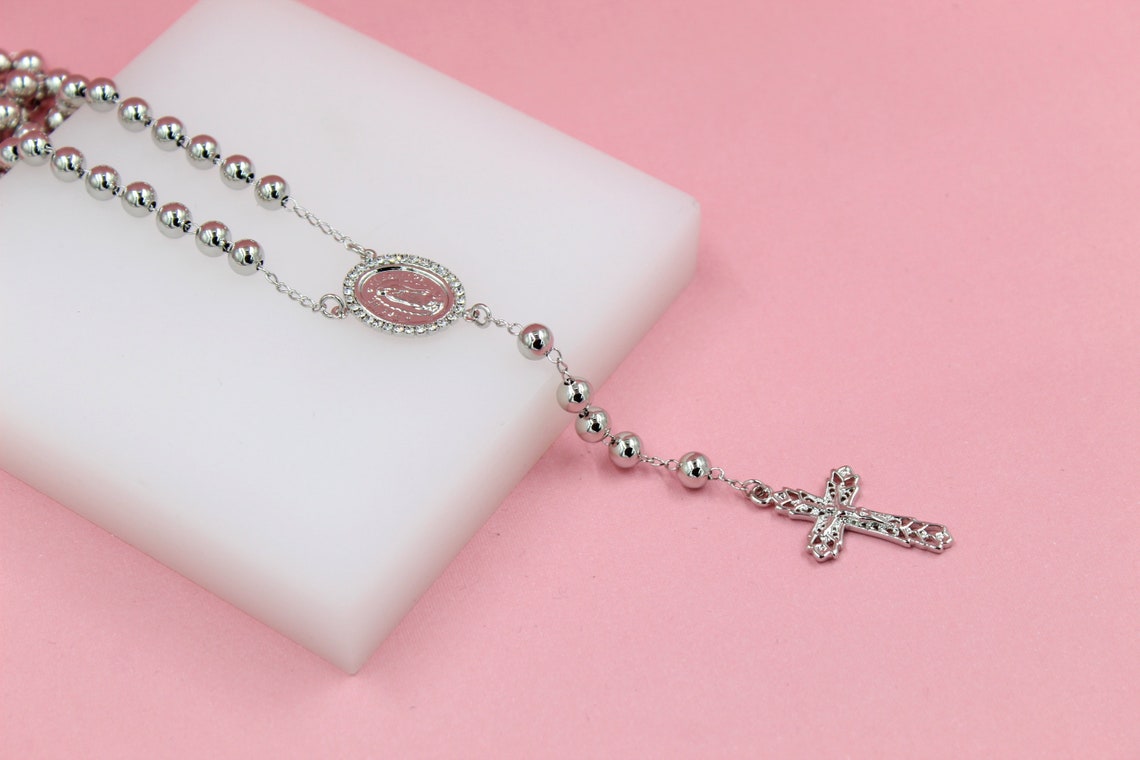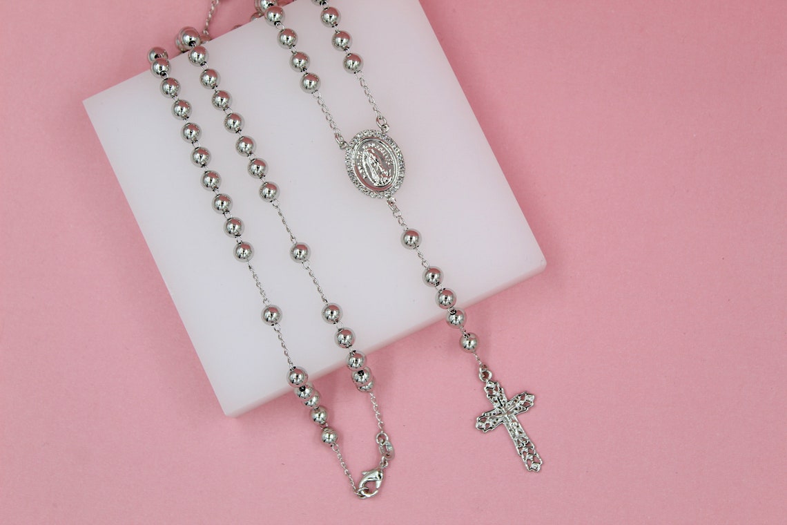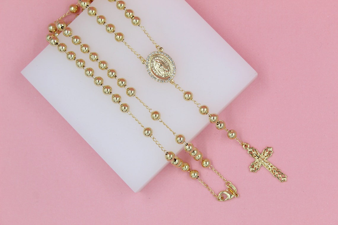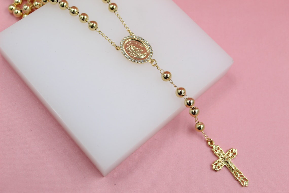 This 18K Gold Filled Catholic Pearl Rosary features a beautiful Crucifix Cross and a Guadalupe Charm. Perfect for any Catholic looking to enhance their prayer experience and showcase their faith with elegance. Made with 18K gold, this rosary is durable and long-lasting, making it a meaningful gift.