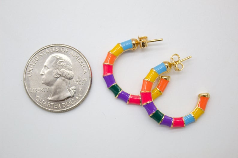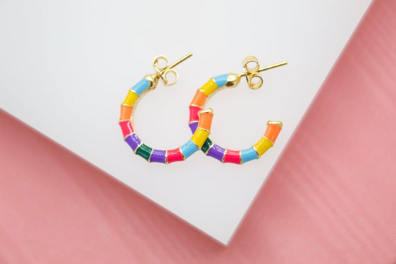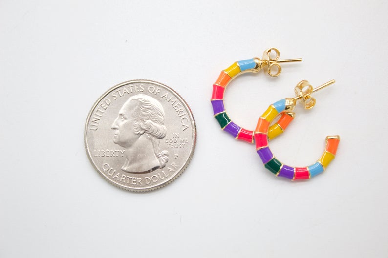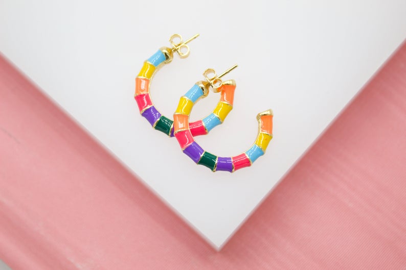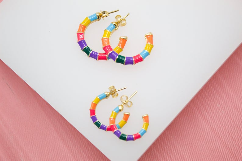 Add a pop of color to your outfit with these 18K Gold Filled Colorful Enamel Open Hoop Stud Earrings (L55). These unique earrings combine playful design with quality materials, making them a fun and stylish addition to any jewelry collection. With a vibrant enamel coating and sturdy gold-filled construction, these earrings are sure to bring joy and flair to your day.